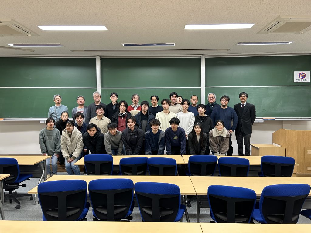 2026年2月16日に、素粒子原子核実験グループ合同の卒業研究発表会がありました。本研究室からは、荒牧咲さん、木倉暖人くん、松井啓悟くんが研究発表を行いました。3人の研究テーマは「宇宙線を用いたμ粒子の寿命とg因子の測定」でした。発表会終了後全員で記念撮影も行いました。